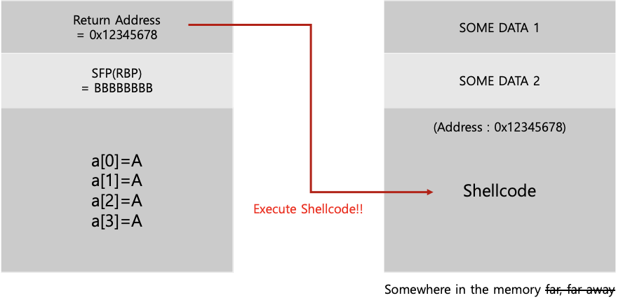 컴파일 후 바로 pwndbg를 이용해 분석해봤습니다. strcpy의 실행이 종료된 후 rbp 값을 보면 a 배열에 미처 담지 못하고 넘어온 EFGH가 들어가 있는것을 확인할 수 있습니다. 결국 Stack 영역에 정해진 변수의 사이즈보다 더 큰 데이터를 입력할 수 있다면 이를 이용해 Return Address를 조작할 수 있게 된다는 겁니다. 결국 공격자는 메모리 어딘가에 Shellcode를 삽입하고 함수의 Return Address를 Shellcode가 있는 위치의 주소로 덮어 씌워서 함수가 종료됐을때 공격자가 삽입한 Shellcode를 실행하게 유도할 수 있습니다! :)