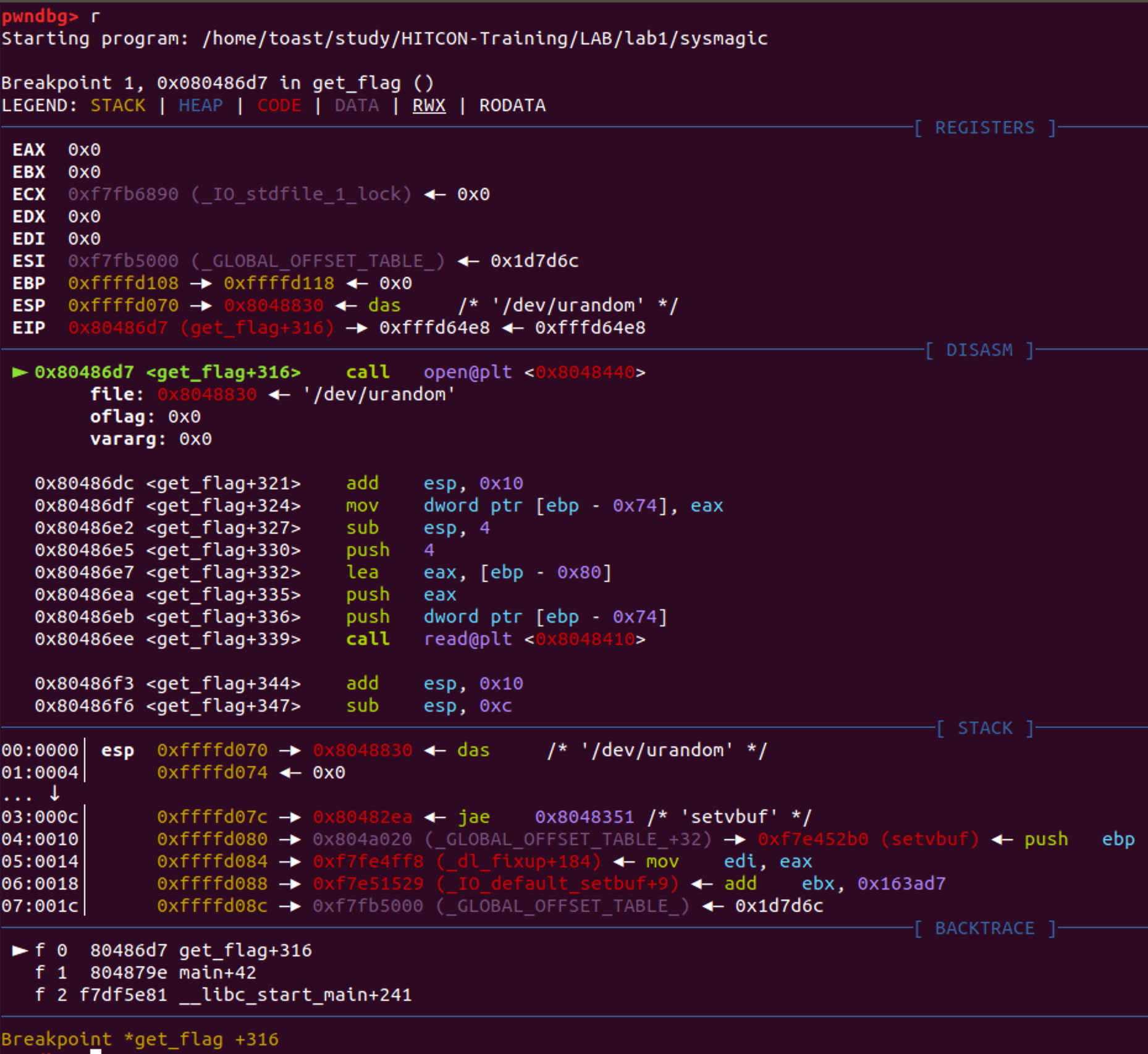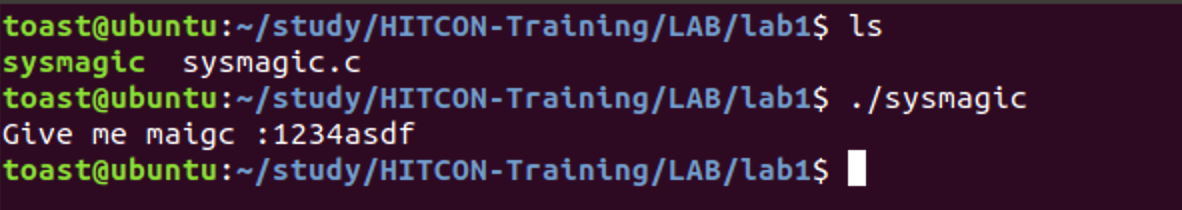 일단 lab1 에 들어가보면 sysmagic이라는 바이너리와 소스코드 파일이 있습니다. 원래 Training 때도 소스코드가 공개 됐었는지는 모르겠지만 보고하면 재미 없을것 같으니 최대한 소스코드는 무시하면서 풀기로 했습니다. 일단 무작정 바이너리를 실행하고 아무런 값이나 넣어봤으나 별다른 반응이 없어서 바로 pwndbg로 까보기로 했습니다.