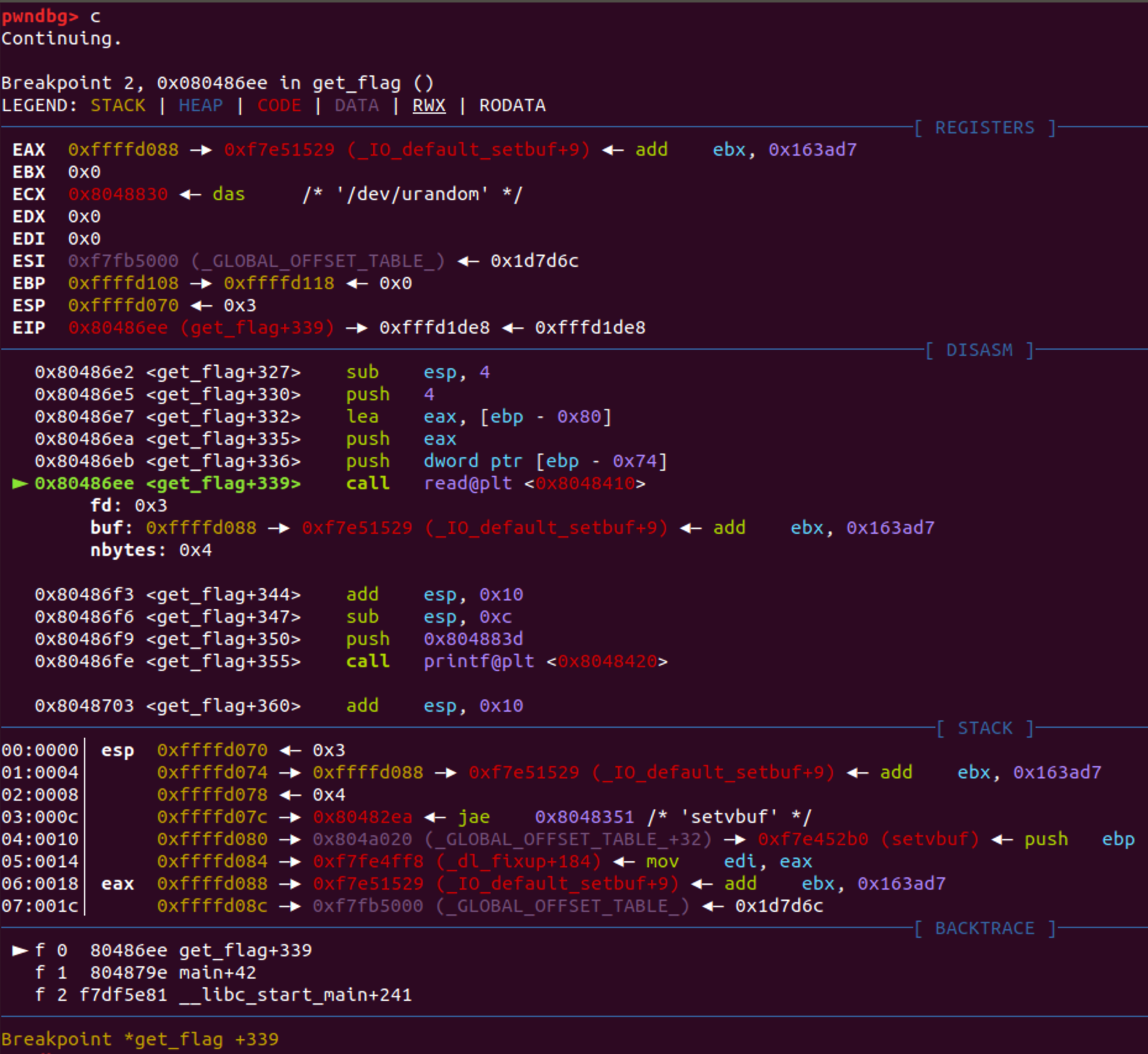 0x080486ee <+339>: call 0x8048410 <read@plt>