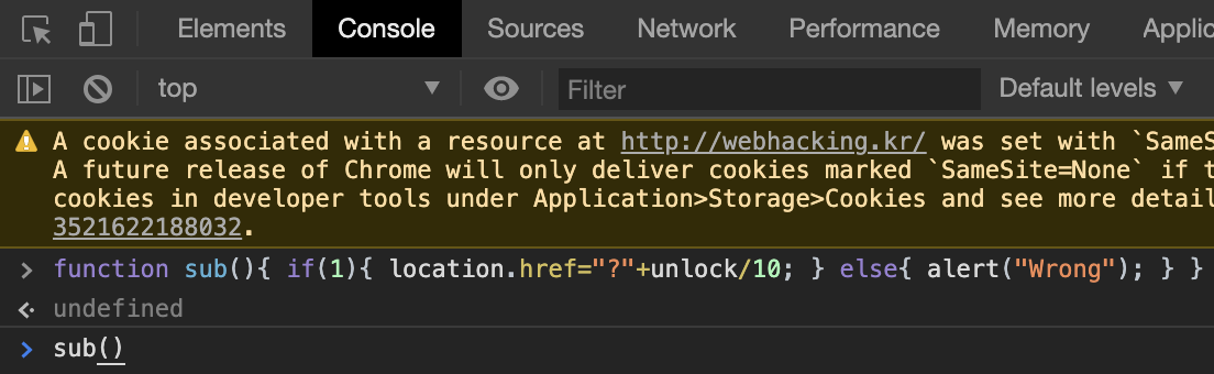 unlock에 굉장히 복잡한 계산을 한 값을 넣고 sub함수에서 사용자가 텍스트 박스에 입력한 값과 unlock값을 비교하여 같다면 문제가 풀리는 방식입니다. 이 문제는 3가지 방식이 있는데 첫번째는 개발자 도구를 이용해 unlock값을 알아내는 방법이고 두번째는 함수를 재정의하는 방법이고 마지막은 직접 계산(...)하는 방법입니다. 세번째 방법은 생략하고 첫번째와 두번째 방법을 소개하겠습니다.