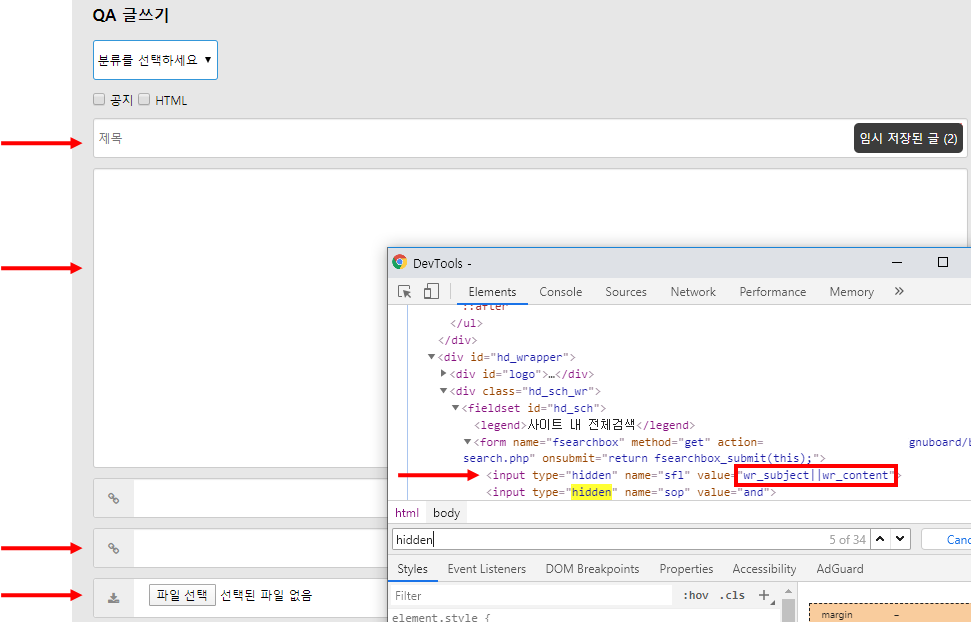 대상은 선정했으니 이제 본격적으로 공격할 곳을 찾아야합니다. 공격 시도할 곳을 간단하게 말씀드리면 '값을 넘길 수 있는 곳 어디든' 입니다. 예를 들어 게시판이라고 했을 때 사용자가 서버에 값을 넘길 수 있는 곳은 게시글 제목, 내용, 태그, 첨부파일, 첨부파일명, 닉네임 등이 있는데 이 부분이 전부 공격 시도할 곳이라고 보시면 됩니다. 이 외에도 개발자 도구를 띄워서 <input type="hidden"> 인 친구들도 value 값을 직접 수정해서 넘기는 방법도 있습니다.