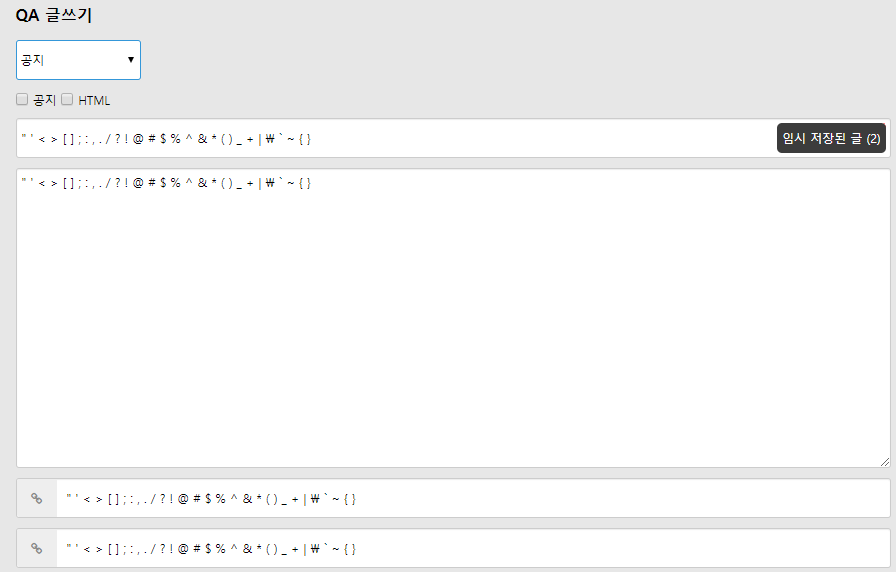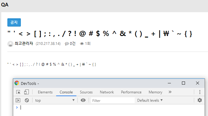 이제 공격할 사이트로 이동 한 뒤 개발자 도구 콘솔 탭을 열고 2번에 있는 특수문자들을 복사해서 사용자 입력 값 부분(제목, 내용, 댓글 등)에 붙여 넣기 한 뒤 서버에 전송해봅니다.