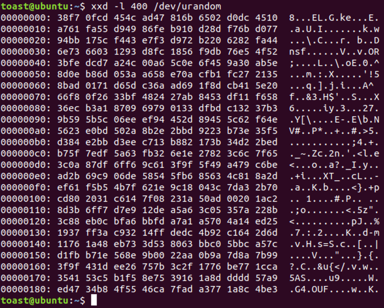 open 함수로 /dev/urandom 이라는 파일을 엽니다. 저 파일은 랜덤한 값들을 만들어주는 파일로 열어보시면 아래와 같은 값을 볼 수 있습니다. 아래는 편의를 위해 길이 제한을 걸어서 그렇지 만약 길이 제한 옵션이 없다면 사용자가 멈추기 전까지 무한으로 뽑아냅니다.