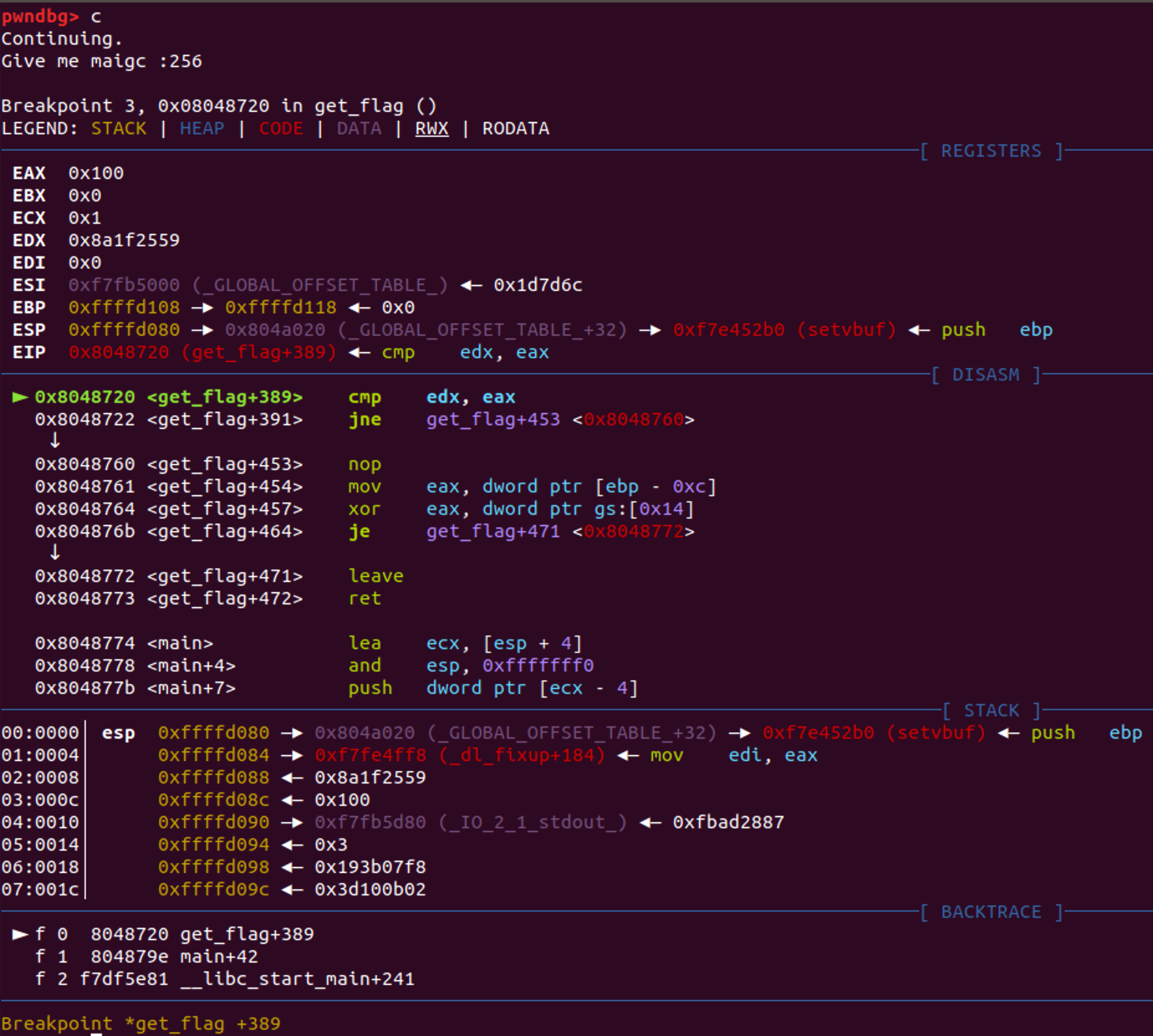 그리고 제가 입력한 256이라는 값이 16진수로 EAX에 들어간 것을 확인할 수 있고 cmp를 통해 EDX에 있는 값(위에서 read를 통해 넣어준 값)과 비교해 분기를 결정합니다. 결국 랜덤한 4바이트 값을 맞춰서 입력해주면 풀리는 문제!