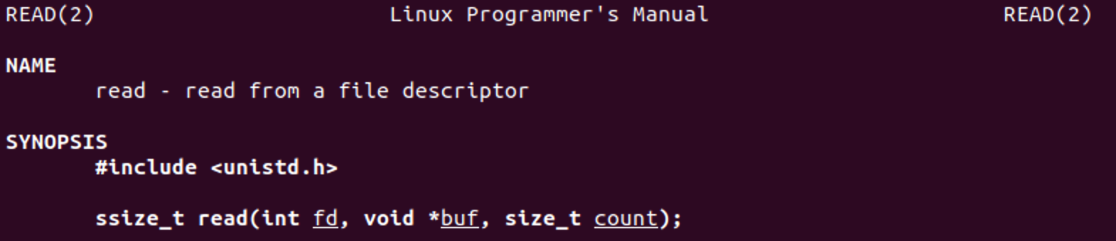 여기선 read 함수로 무엇인가를 하는 것을 확인할 수 있는데 read 함수에 대해 잘 모르시는 분들을 위해 간단하게 설명하고 넘어가겠습니다. 일단 기본적인 read 함수에서 사용하는 인자값들은 아래와 같습니다.