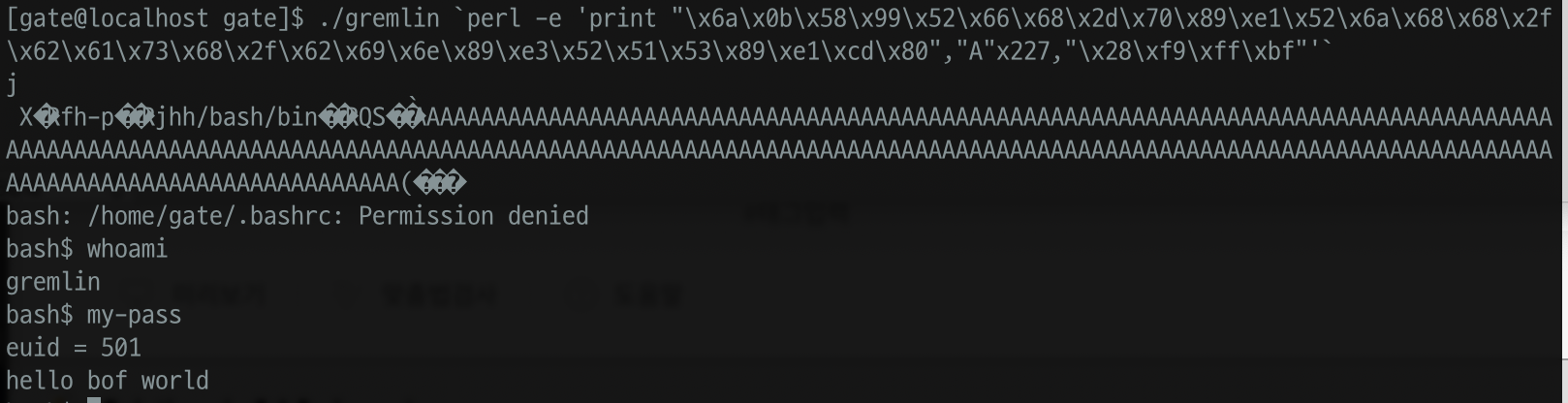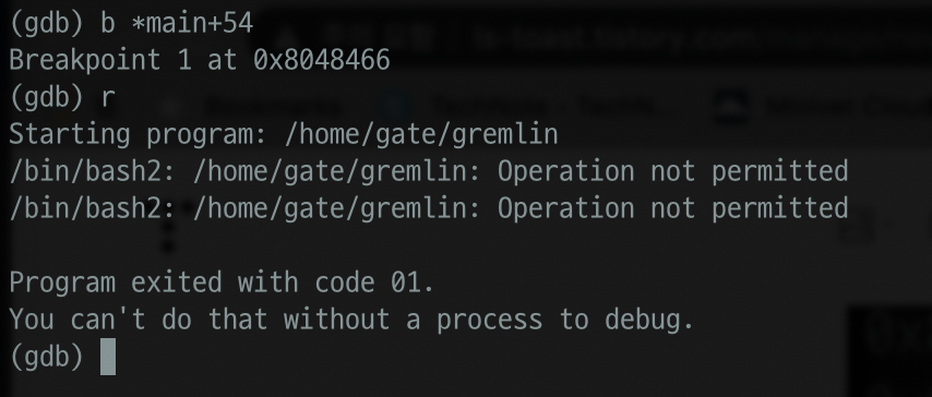 권한 문제로 진행이 되지 않습니다! 아까 위쪽에 있던 cremlin이 이 문제를 해결하기 위해 있던겁니다. gremlin 바이너리 자체가 권한이 gremlin이라는 계정에 있는데 이 바이너리를 복사해주면 gate에게 권한이 있는 바이너리가 생성됩니다. 그러면 권한 문제가 깔끔하게 해결이 됩니다. 그럼 바이너리를 복사하고 아까 얘기했던 분석을 진행해보도록 하겠습니다.