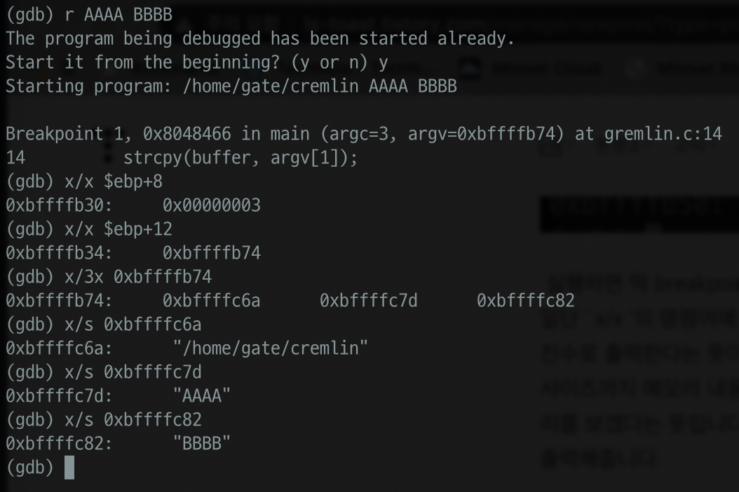 인자값으로 AAAA와 BBBB를 넘겨줘서 다시 실행시켜줬습니다. 중간에 띄어쓰기 꼭 넣어주셔야합니다. 그리고 argc에 해당하는 주소를 살펴보니 2에서 3으로 변경되어 있고 argv 포인터에 해당하는 주소를 살펴보니 3개의 주소 안에 바이너리의 경로와 인자값 AAAA와 BBBB가 있는 것을 확인할 수 있습니다. 이쯤되면 argc와 argv가 뭔지 감이 오실거라 생각합니다만 혹시 아직 잘 모르겠다 하시는 분들을 위해 한번 정리해보자면
