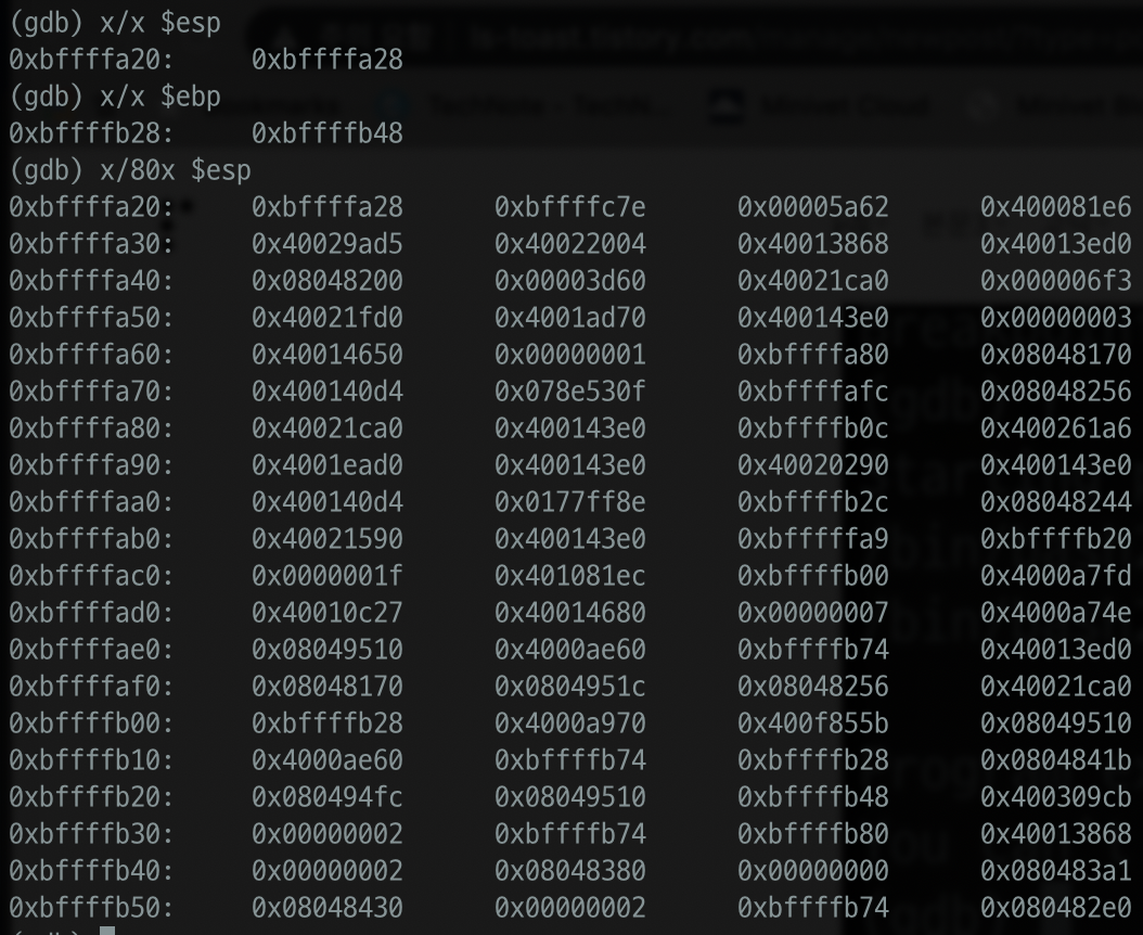 실행하면 딱 breakpoint를 걸었던 곳에서 프로그램이 멈추는데 이때 x/x 명령어를 통해 레지스터와 메모리 내용들을 살펴볼 수 있습니다. 일단 ' x/x '의 명령어에 대해 설명드리자면 앞의 x 는 eXamine memory를 뜻하고 뒤의 x 는 heX를 뜻합니다. 그러니까 메모리의 내용을 16진수로 출력한다는 뜻이 됩니다. 그리고 뒤쪽 x앞에 숫자는 사이즈라고 생각하시면 되는데 정확히는 지정된 주소부터 지정된 단위의 지정된 사이즈까지 메모리 내용을 출력해 달라는 뜻입니다. 예를 들어 위에 나와 있는 x/80wx $esp는 현재 esp의 주소부터 80 Word 만큼의 메모리를 보겠다는 뜻입니다. 만약에 Double Word만큼 보겠다면 x대신 gx를 적어주면 되겠습니다. 그냥 x만 적는 경우 이전에 사용한 단위로 출력해줍니다.