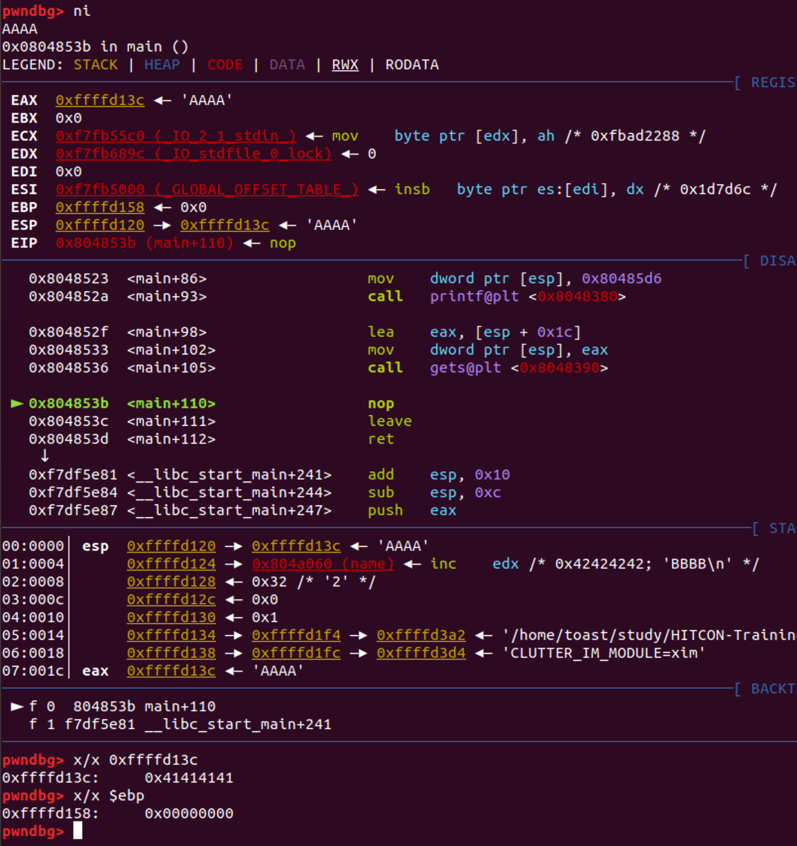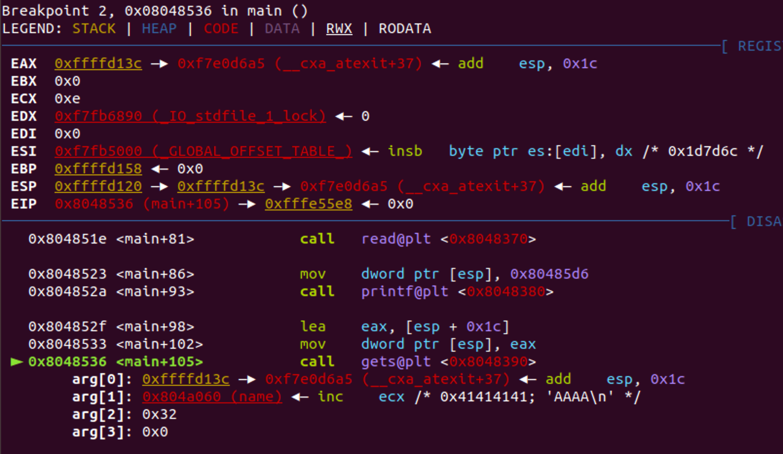 gets를 호출하는 부분을 보면 arg[0]~[3]까지 존재하는데 arg[1]~[3]은 이전에 read함수를 호출할때 남아 있던 인자값들이며 gets함수에 영향을 주지 않습니다. 단, arg[0]는 입력한 값들을 저장할 주소입니다. 일단 A를 4개 넣고 넘어갑니다.