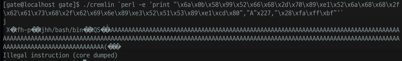 예상과 다르게 Illegal instruction이 터지면서 프로그램이 종료됩니다. 그 이유는 argv에 있습니다. gdb에서 위와 같은 코드를 그대로 실행하고 분석해보겠습니다.