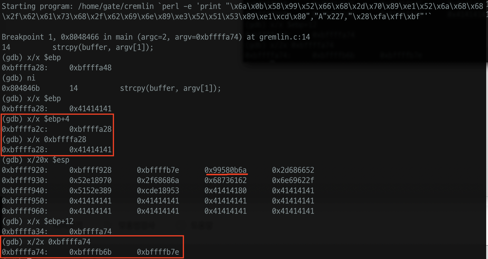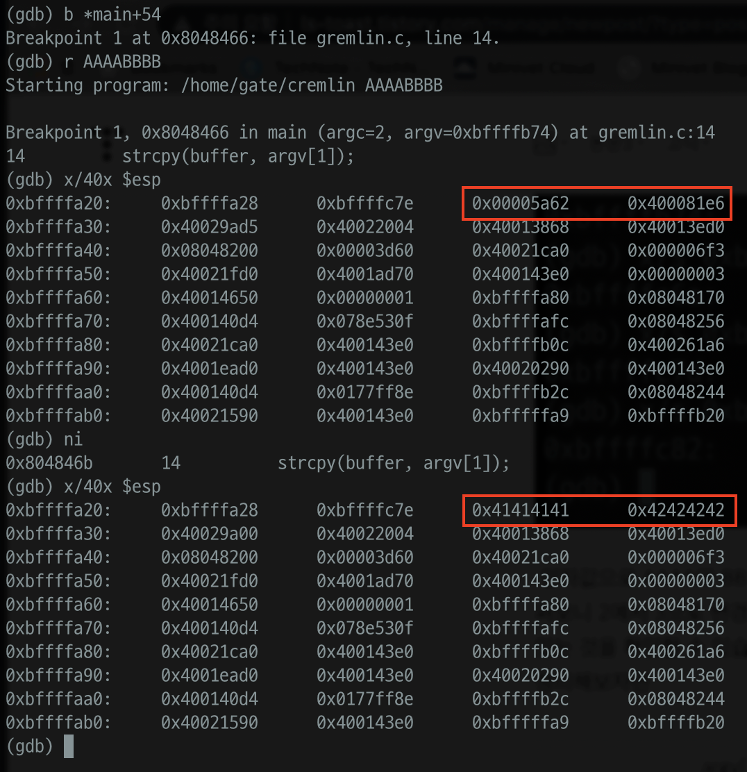 위에서 확인할 수 있듯이 0xffffd088이라는 곳에 0x8a1f2559라는 값이 들어갔습니다.