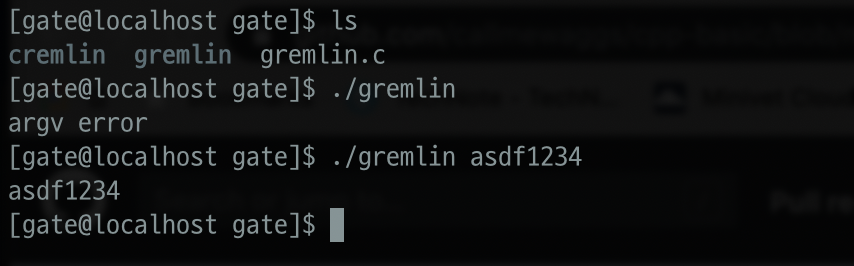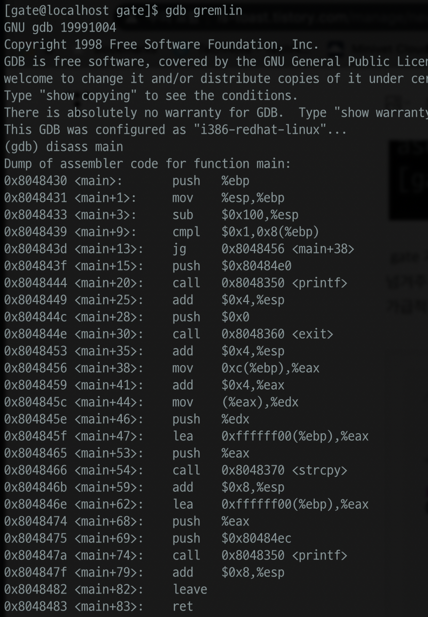 gate 계정으로 로그인하면 위와 다르게 gremlin과 gremlin.c가 있을겁니다. 그리고 실행해보면 argv error를 뱉어내고 실행할때 인자값을 넘겨주면 입력한 인자값 그대로 출력하고 프로그램이 끝이 납니다. 그럼 바로 gdb로 분석을 시작해보겠습니다. 소스 파일을 보셔도되지만 가급적 보지 않는 것을 추천드립니다. 아래 접힌글에 코드를 첨부했으니 참고하실분들은 참고하시길 바랍니다.