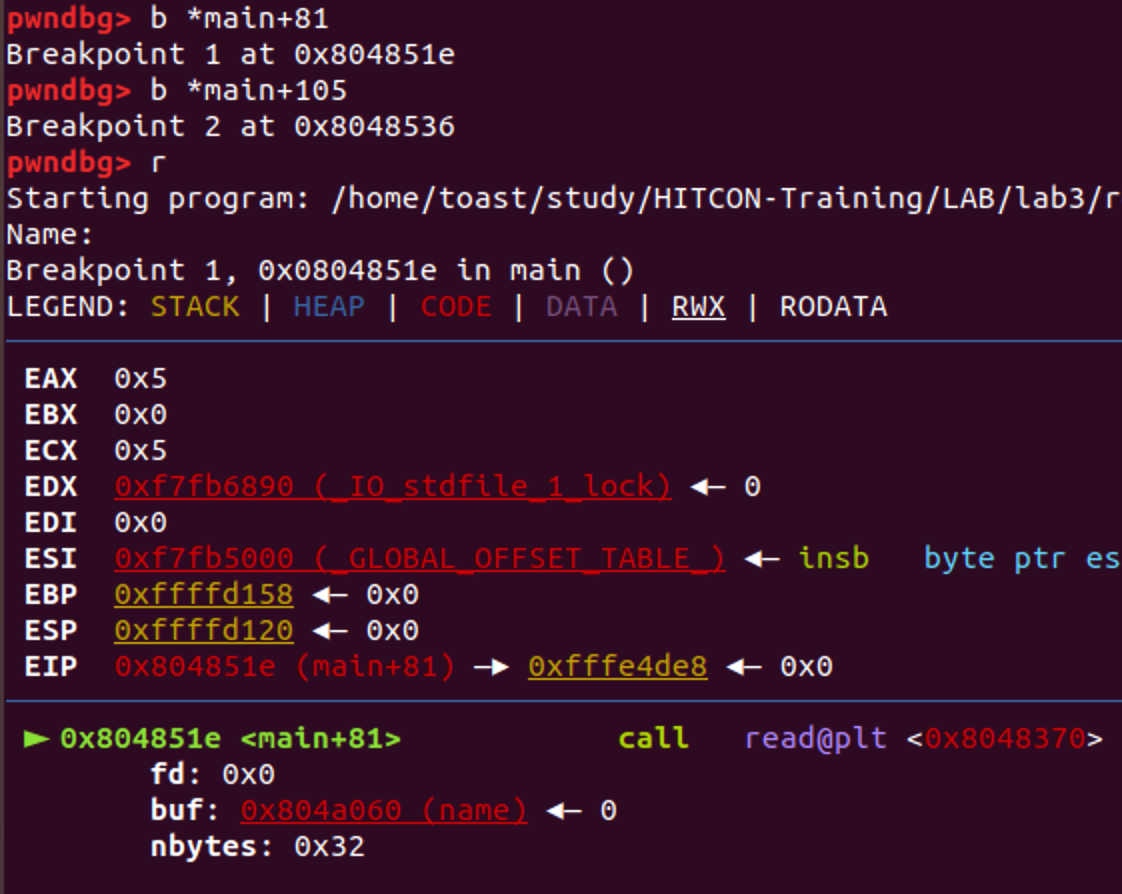 main을 보면 setvbuf, printf, read, gets가 눈에 들어옵니다. 이 문제의 포인트는 gets 함수입니다. C/C++ 코딩 경험이 좀 있으신 분들은 아실지도 모르겠습니다만 gets함수의 경우 사용자 입력을 받는 함수입니다. 그리고 이게 문제의 포인트가 되는 이유는 gets함수는 입력 길이에 제한을 두지 않습니다. 예를들어 char a[30] 를 선언하고 gets(a)를 했을때 길이가 50짜리인 문자열을 입력할 경우 30byte까지는 a에 들어가지만 남는 값들은 전부 overflow 됩니다. 좀 더 정확한 분석을 위해 입력을 받는 부분인 read와 gets에 breakpoint를 걸고 진행해보겠습니다.
