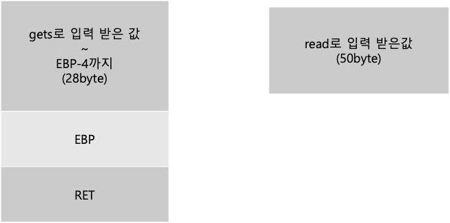 A 4개가 0xffffd13c에 잘 들어간것을 확인했습니다. 그리고 ebp의 주소를 확인해보니 0xffffd158입니다. 자 그럼 현재까지 모은 정보를 정리해보면 마음껏 쓸 수 있는 50Byte짜리 공간이 메모리 어딘가에 있고, 길이를 체크하지 않는 함수를 써서 입력 받는 함수가 있고, 입력값은 ebp와 0x1c(28)만큼 차이나는 곳에 저장이 됩니다. 그럼 대충 아래와 같은 방법이 먹히겠네요!